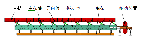 雙質體共振輸送機采用兩臺振動電機作為激振動源,運用自同步原理,兩臺振動電機反向轉動,使輸送機底部平衡架產生往復振動,經過主振簧與導向板簧的作用,帶動上部輸送槽振動,從而達到輸送物料的目的。雙質體共振輸送機有敞開式、封閉式兩種,料槽橫截面可以做成圓形、矩形和梯形等多種型式。雙質體共振輸送機料槽使用橡膠彈簧或鋼簧支承,依靠固定在料槽上的兩臺振動電機的自同步運轉,,使料槽產生直線振動,通過調節變頻器(一般為45Hz~47Hz)和激振力大小,使物料平穩輸送。